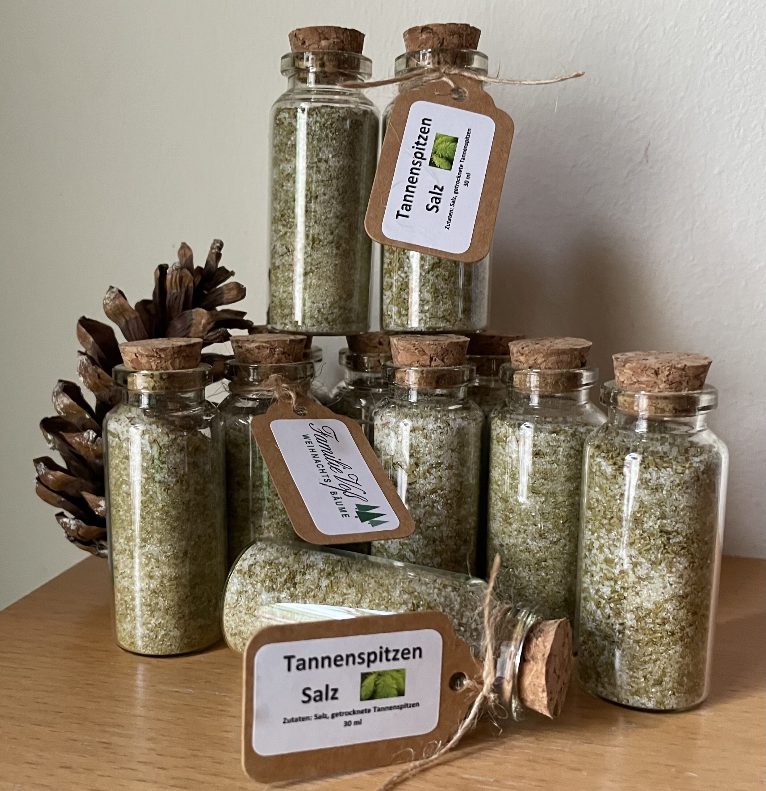 Nach dem Tannenspitzengelee und dem –likör haben wir in diesem Jahr TANNENSPITZENSALZ hergestellt. Dafür werden die jungen Triebe im Backofen getrocknet, zerkleinert und mit Salz gemischt. Fertig ist ein duftendes Tannenspitzensalz. Dieses kann wie ein Kräutersalz benutzt werden, schmeckt aber besonders gut bei Wildgerichten. Probieren Sie es gerne aus.
